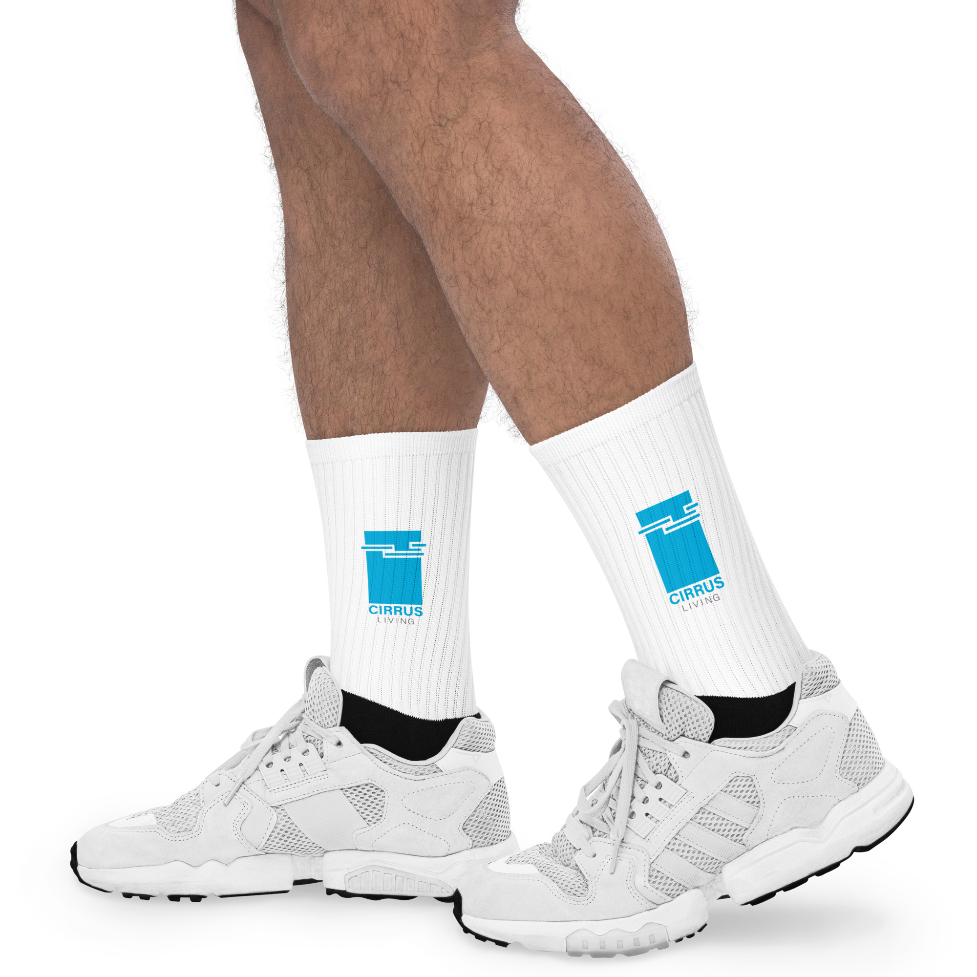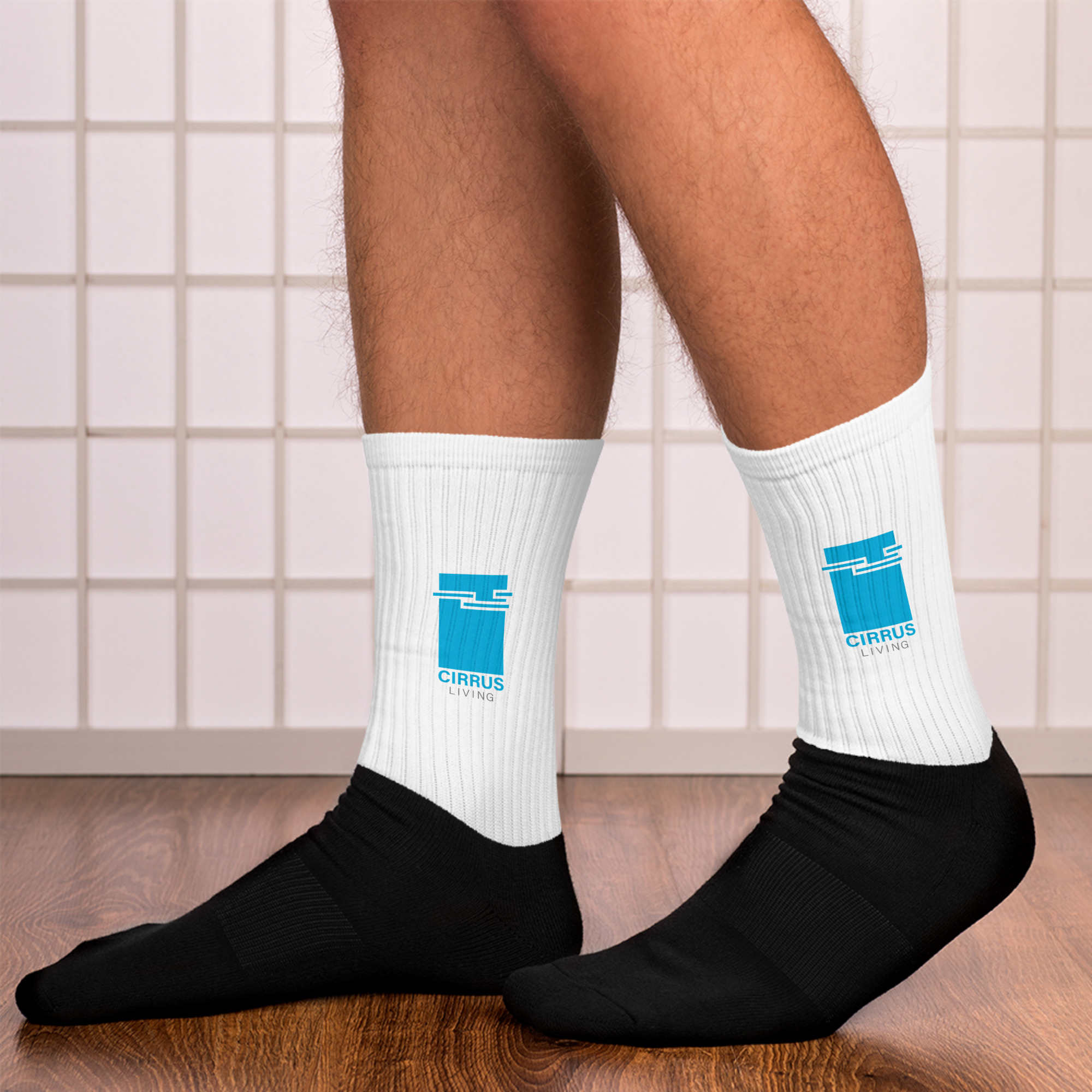 Diese Socken sind dank ihres gepolsterten Bodens besonders bequem. Der Fuß ist schwarz. Der Druck ist entlang des Beins mit klaren, kräftigen Farben, die nicht verblassen.